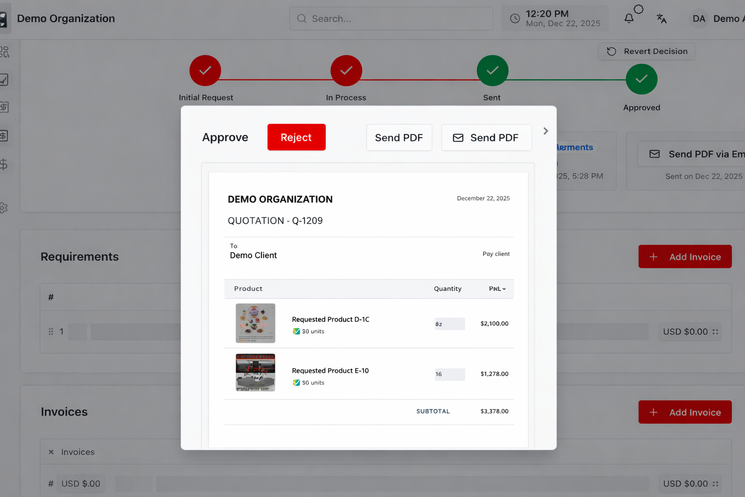 TradeFlow allows your team to build professional quotations with full visual and technical detail. Upload product images, specifications, and commercial terms, and organize each quotation clearly — even when working with multiple products and suppliers.