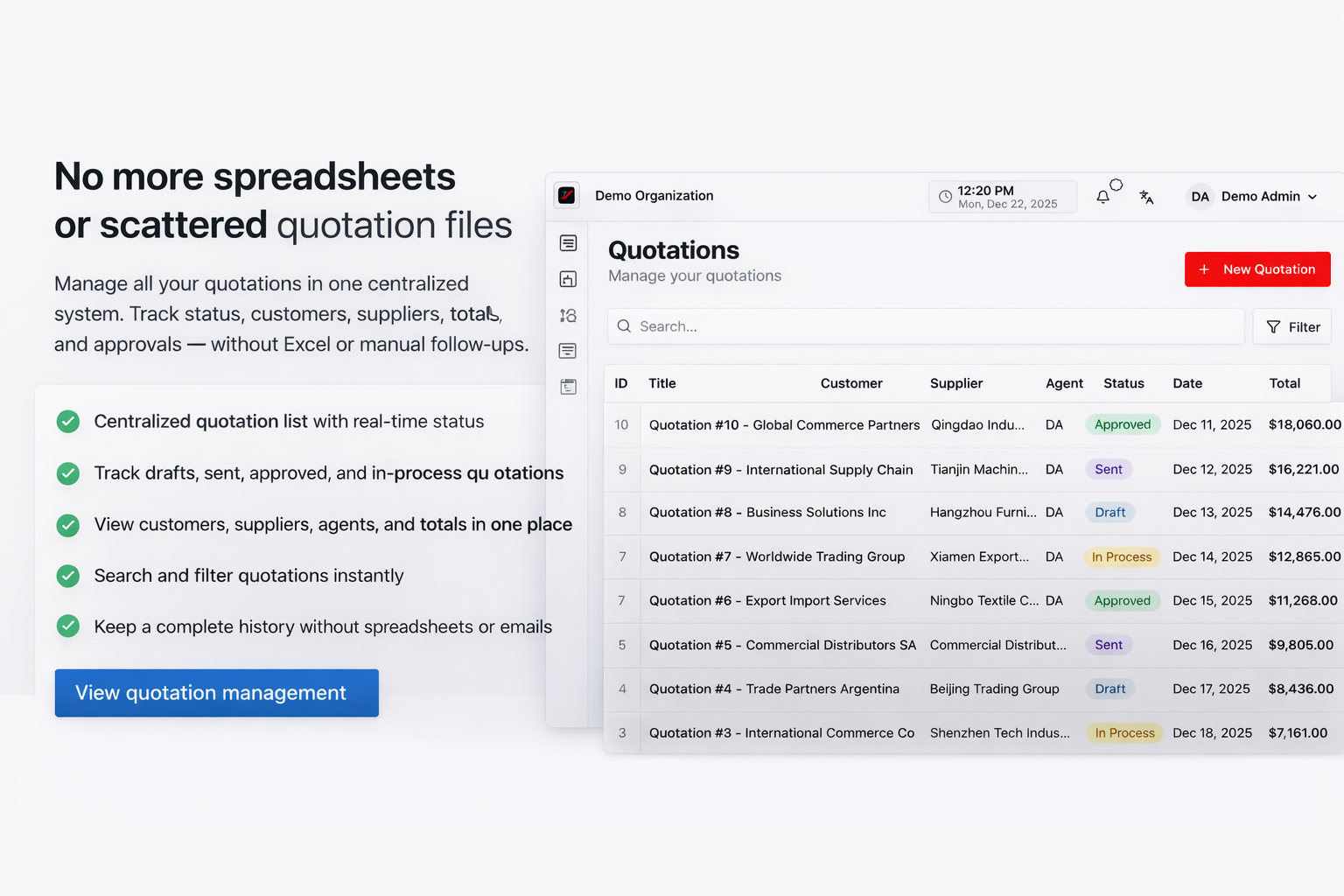 TradeFlow centralizes sourcing, quotations, approvals, billing, and financial tracking for companies operating in China.