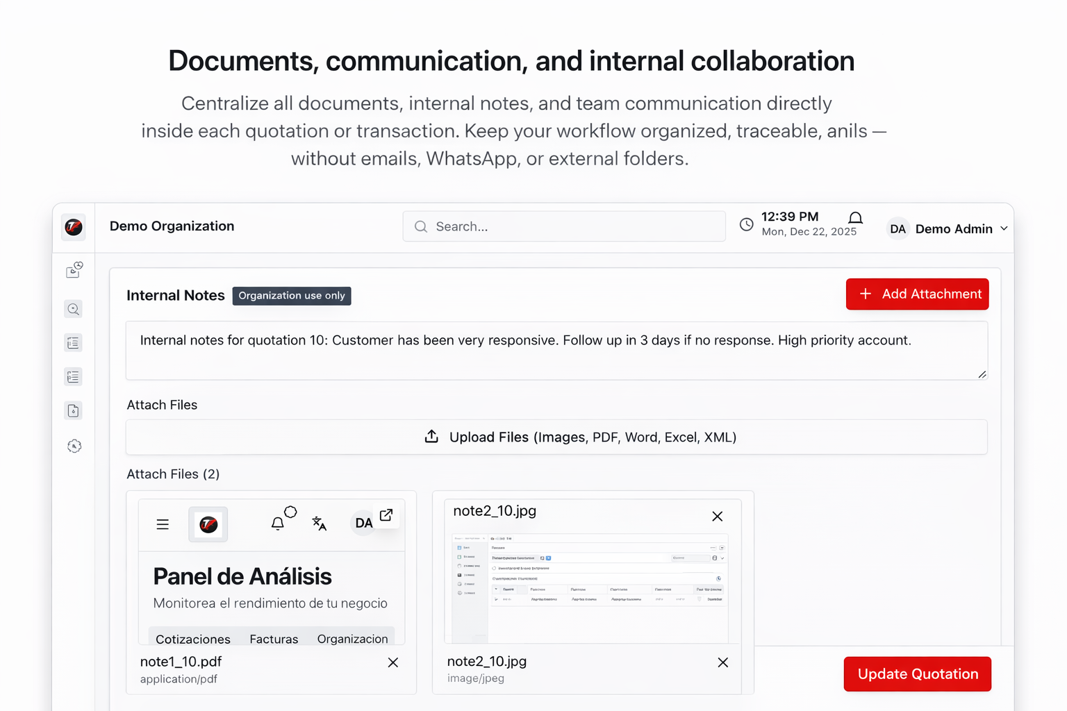 Upload files, supplier documents, photos, invoices, and specifications directly to each operation. Your team stays aligned with real-time notifications, internal comments, and full activity logs.